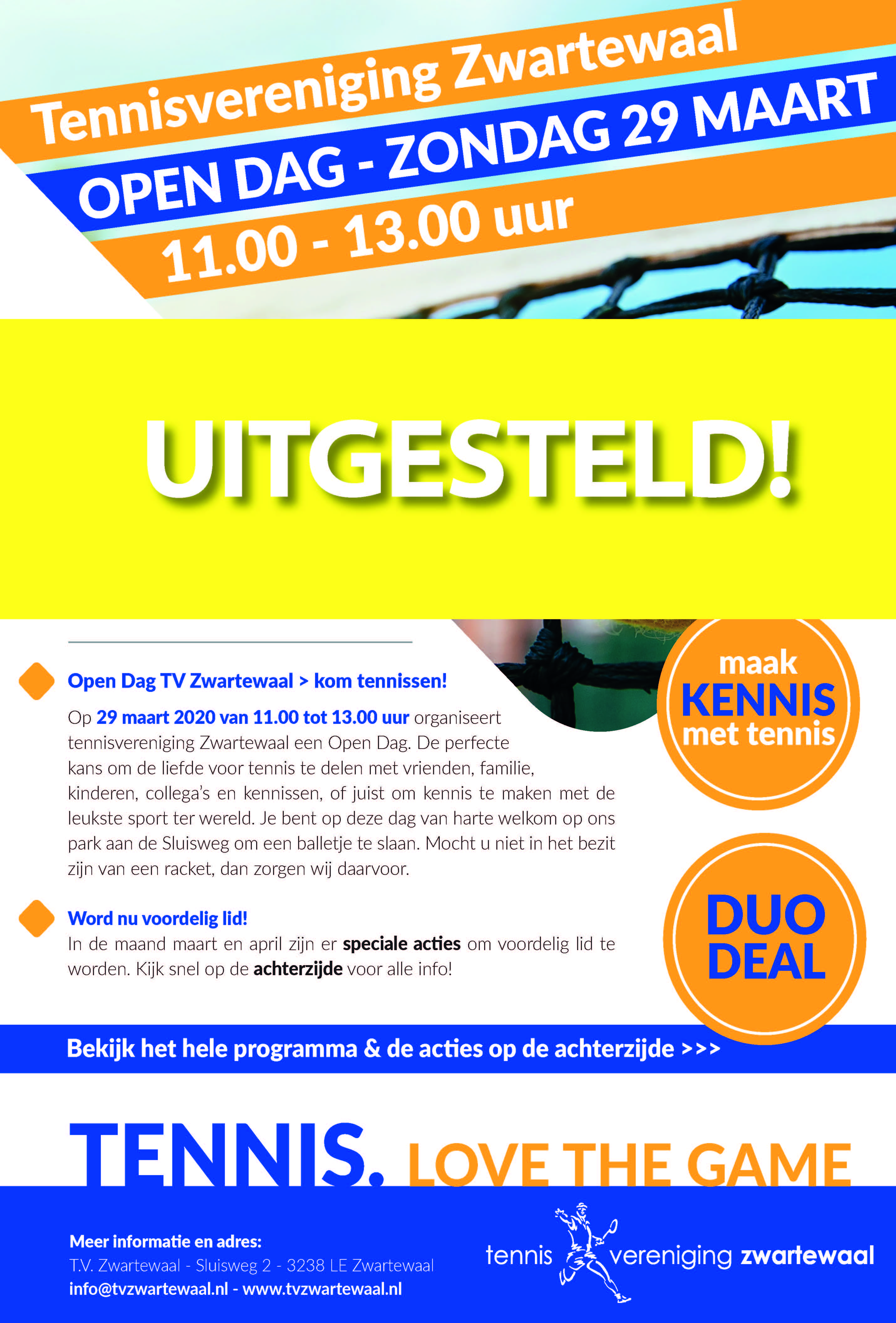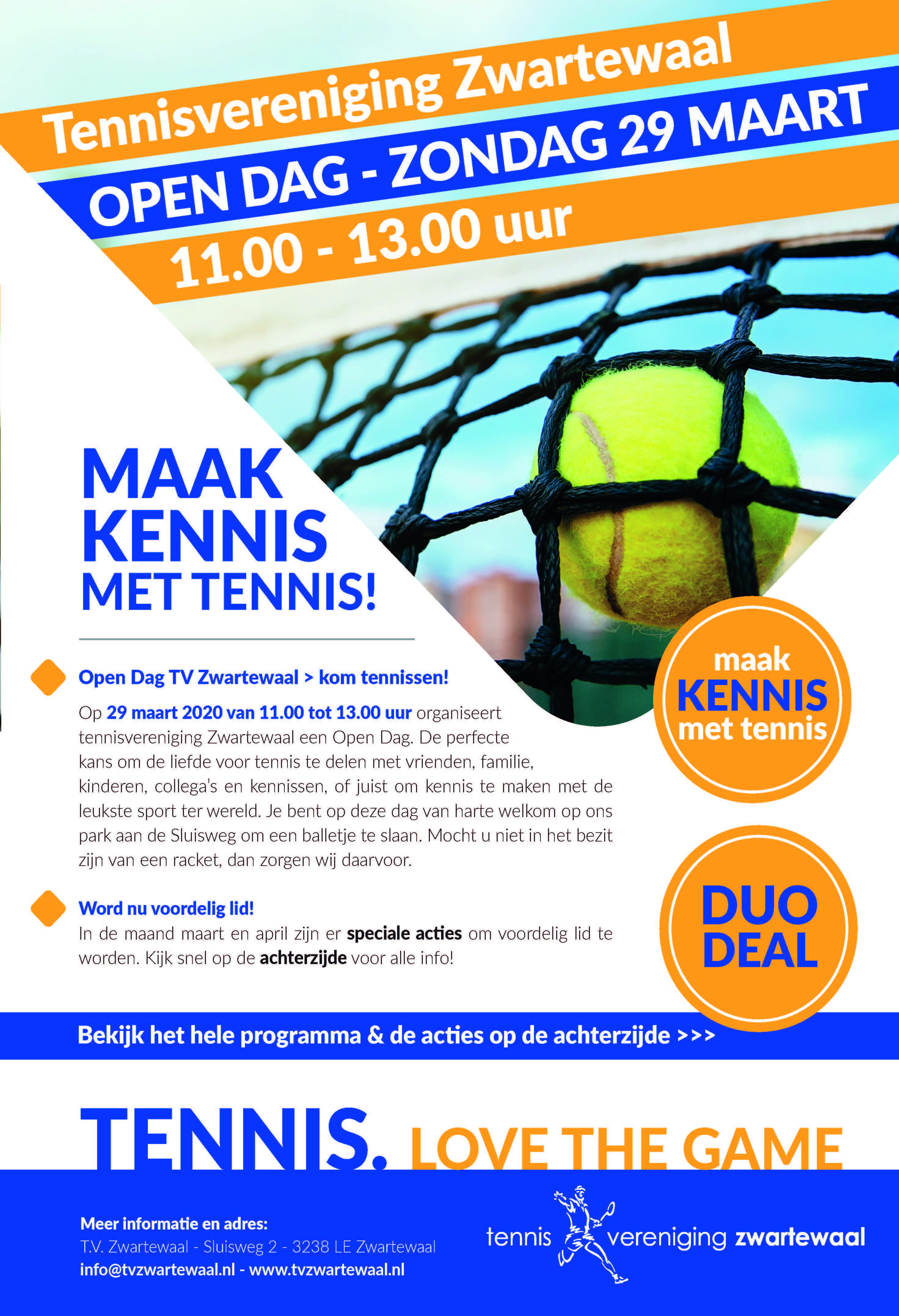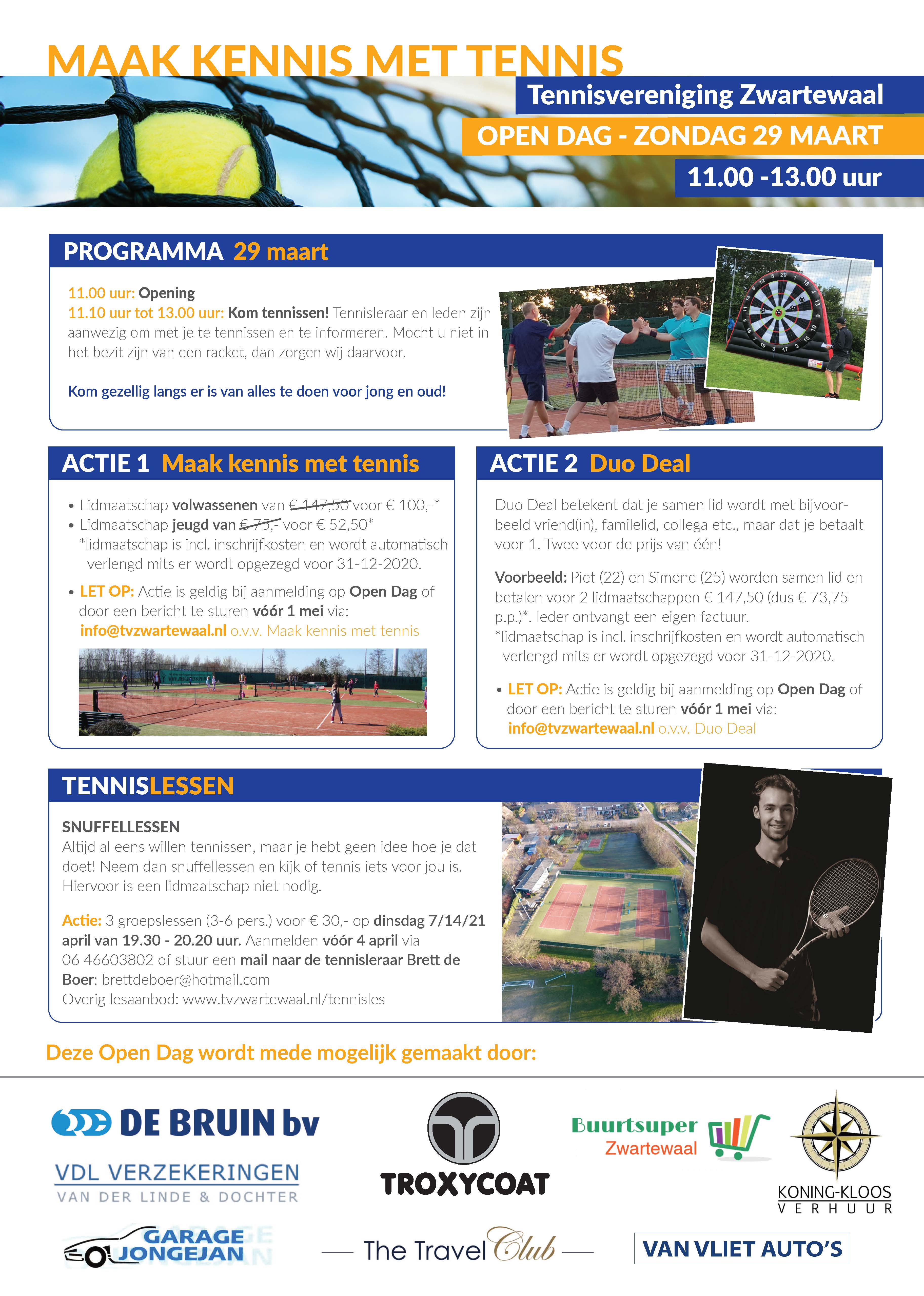 Aankomende week zal bij alle inwoners van Zwartewaal de flyer van de Open Dag in de bus vallen. Op deze flyer staan 2 acties om voordelig lid te worden, namelijk de actie 'Maak kennis met tennis'* en de actie 'Duo Deal'**. Let op, want deze acties zijn alleen geldig in de maand maart en april van dit jaar.